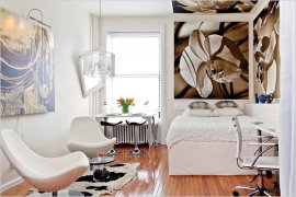 Чтобы студия не выглядела однообразно, а белая мебель не сливалась со стенами, дизайнер создала визуальные границы для каждой зоны. Так, кровать отделена от остальной части комнаты большими постерами, зона отдыха очерчена черно-белой шкурой, картиной и большим потолочным светильником. Граница обеденного стола выделена черными барными стульями. Для равновесия общей композиции небольшой яркий акцент есть даже у кухонного уголка, умеренный настолько, чтобы не отвлекать внимание на себя.